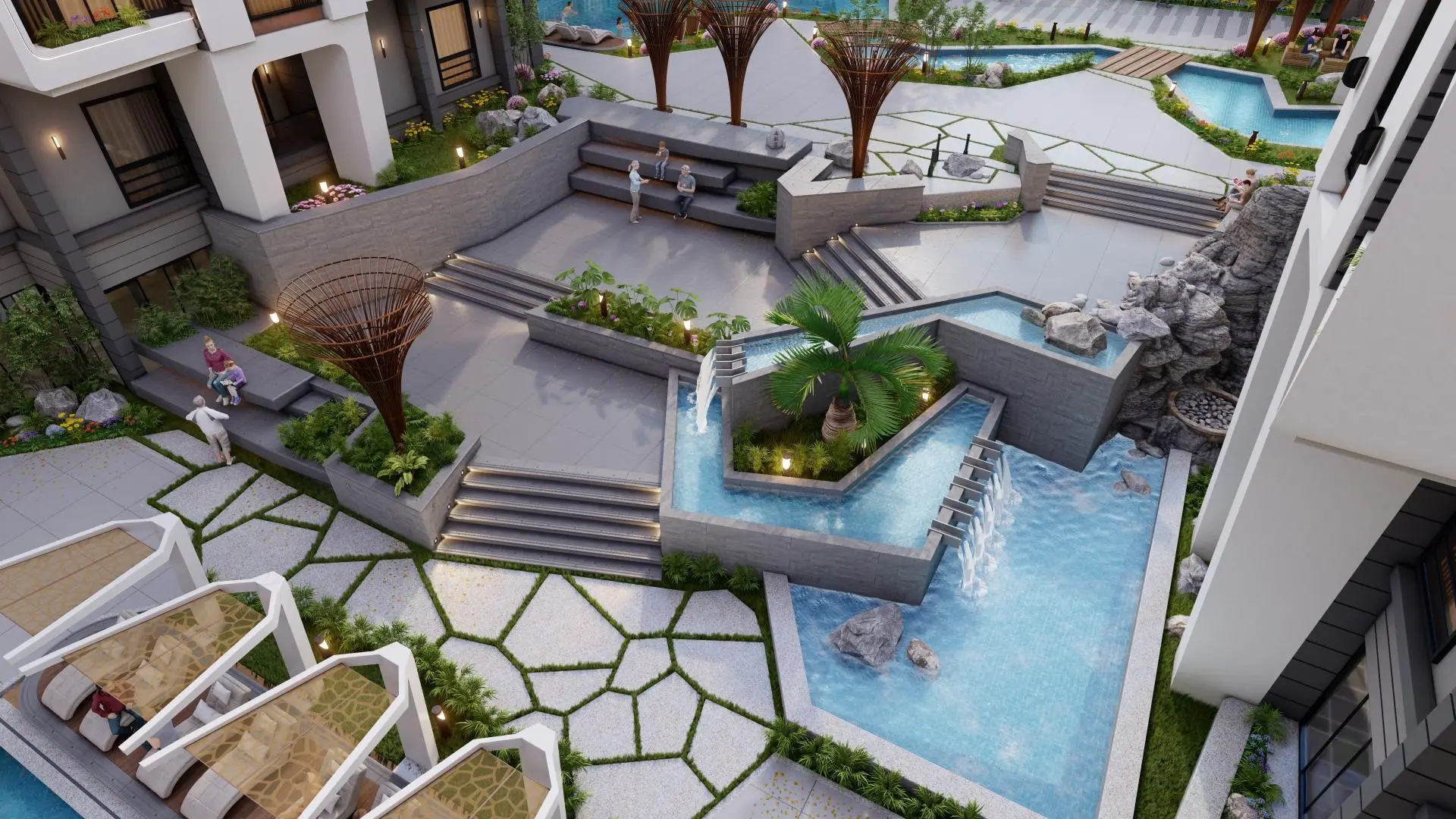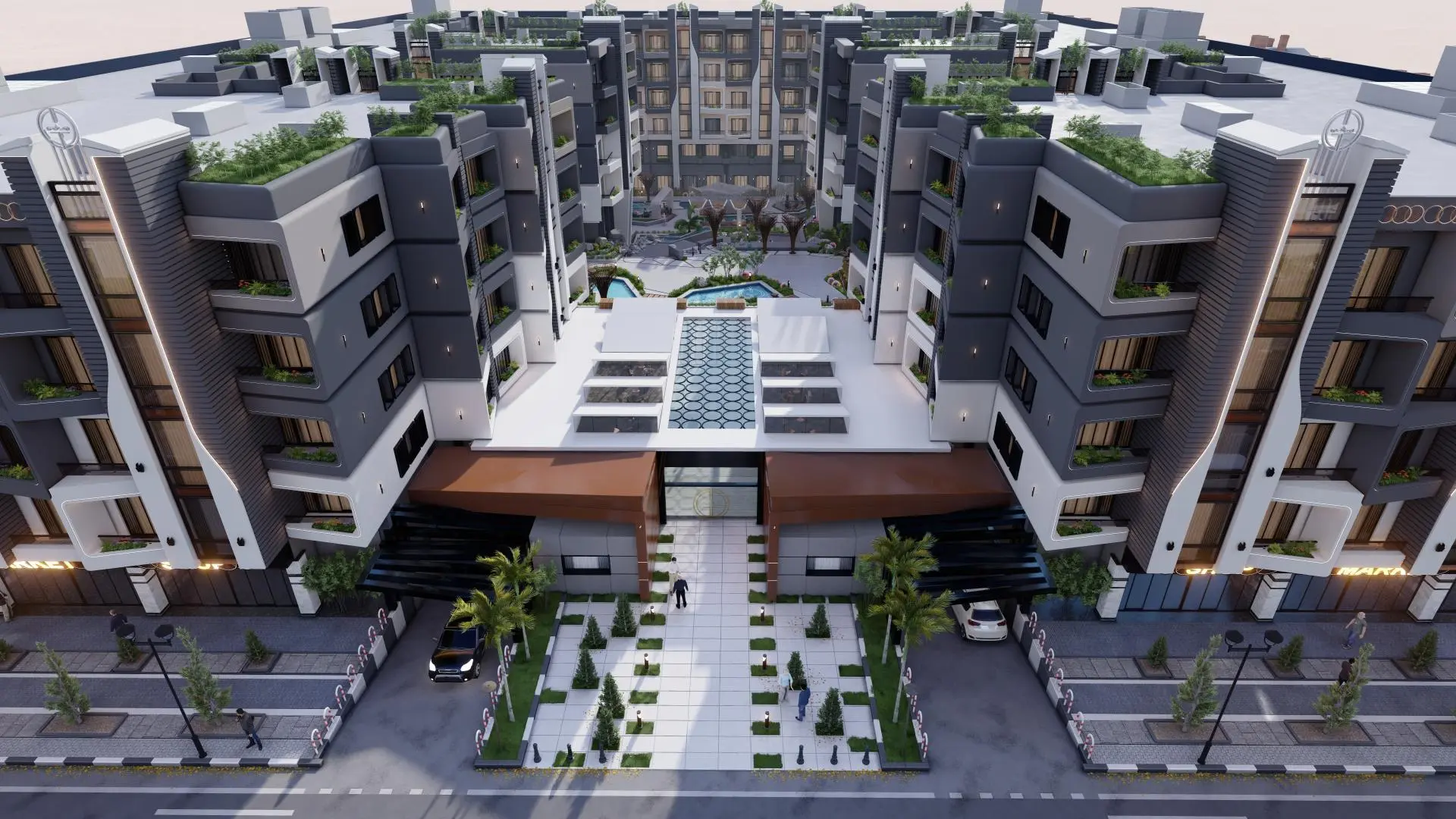 The compound spans a vast area of 9,000 square meters, with 60% of the space dedicated to lush green landscapes, water features, and open recreational areas. Its thoughtfully designed layout creates a serene and secure environment for families, couples, and individuals alike.